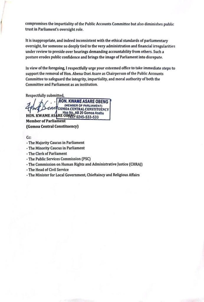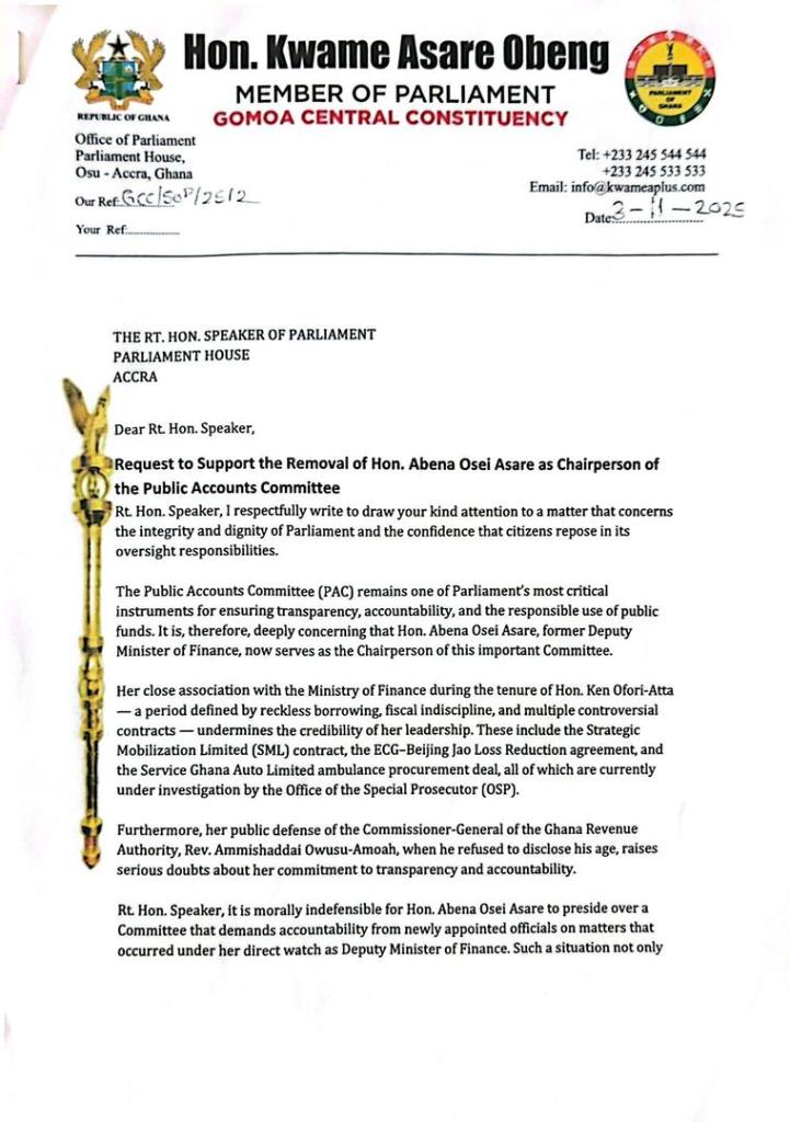 Gomoa Central Member of Parliament, Kwame Asare Obeng, popularly known as A Plus, has written to the Speaker of Parliament requesting the removal of Hon. Abena Osei Asare as Chairperson of the Public Accounts Committee (PAC).