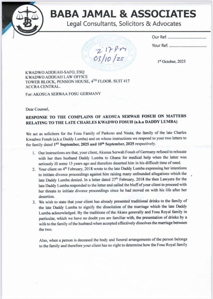 According to the lawyers, Akosua Serwaa refused to relocate to Ghana some 15 years ago when Daddy Lumba came back to the country to seek medical care.