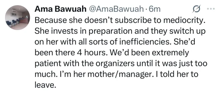 Amaarae’s mother and manager, Ama Bawuah, explained that the organisers failed to keep to agreed timelines, despite the singer’s readiness to perform.