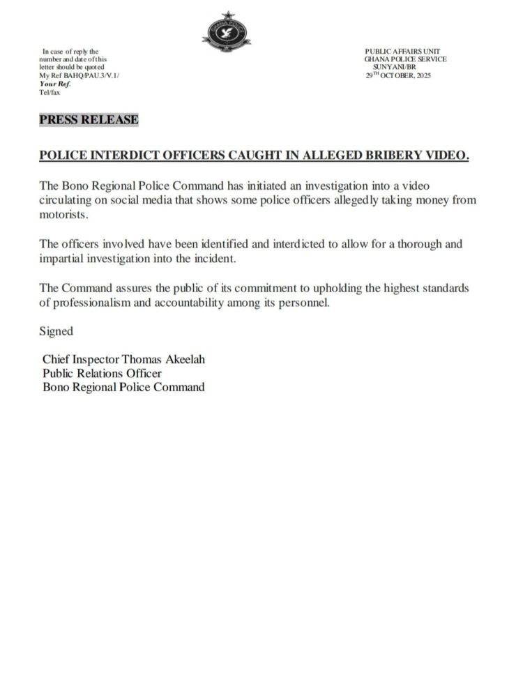 The Bono Regional Police Command says it has initiated an investigation into a video circulating on social media that shows some police officers allegedly taking money from motorists.