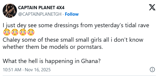 “I just dey see some dressings from yesterday’s Tidal Rave. Chale, some of these small small girls, I don’t know whether them be models or pornstars. What the hell is happening in Ghana?” he wrote.