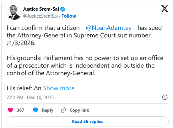 “I can confirm that a citizen — @NoahAdamtey — has sued the Attorney-General in Supreme Court suit number J1/3/2026,” Justice Srem-Sai said.