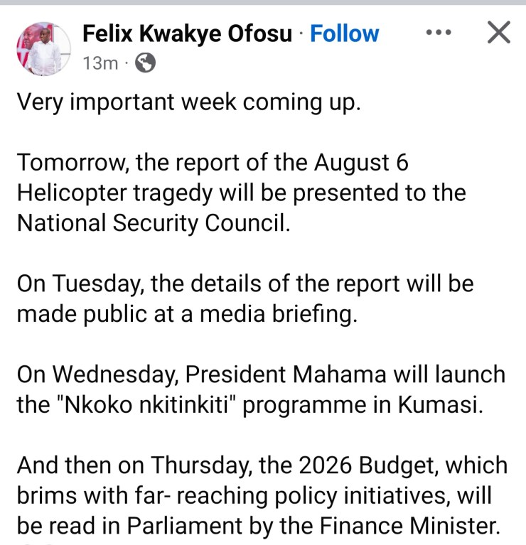 The Minister in charge of Government Communications, Felix Kwakye Ofosu has announced a busy week ahead, highlighting the presentation of the August 6 helicopter crash report.