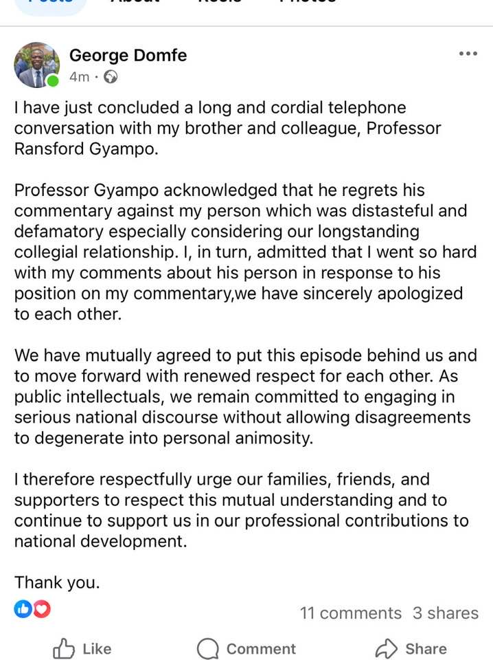 A senior lecturer at the University of Ghana, Dr. George Domfe, says he has resolved his recent public disagreement with fellow academic Professor Ransford Gyampo, following what he described as a “long and cordial telephone conversation” between the two.