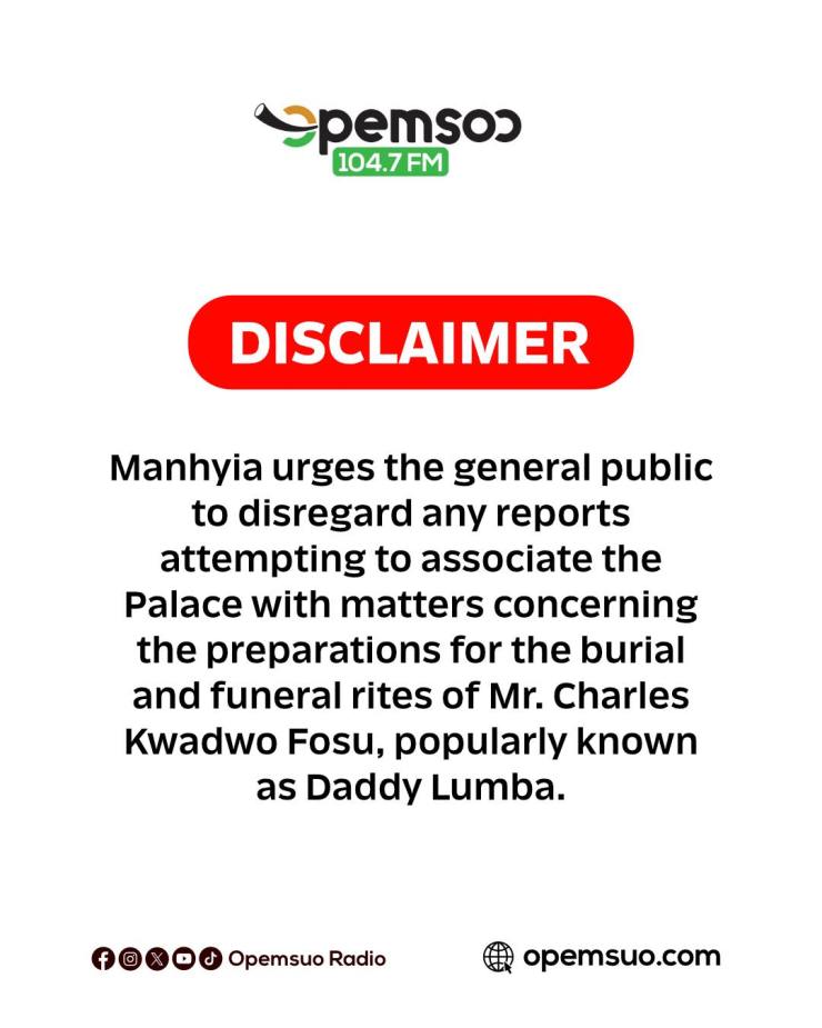 A statement shared by the media wing of the palace said, “Manhyia urges the general public to disregard any reports attempting to associate the palace with matters concerning the preparations for the burial and funeral rites of Mr Charles Kwadwo Fosu, popularly known as Daddy Lumba.