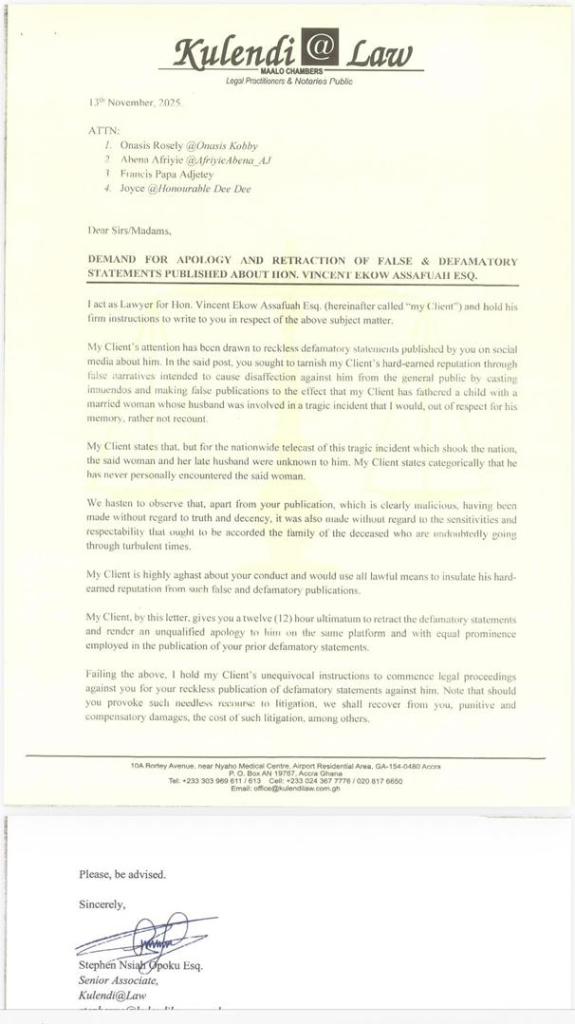 In a letter dated November 13, 2025, and signed by Stephen Nsiah Opoku Esq., Senior Associate at Kulendi@Law, the individuals, Onasis Rosely, Ahema Afriyie, Francis Papa Adjetey, and Joyce (Honourable Dee Dee), were given a 12-hour ultimatum to retract their statements and issue an apology.
