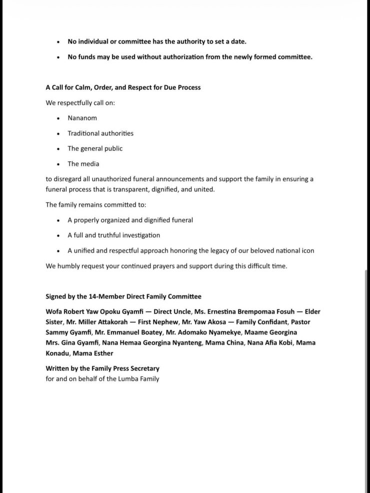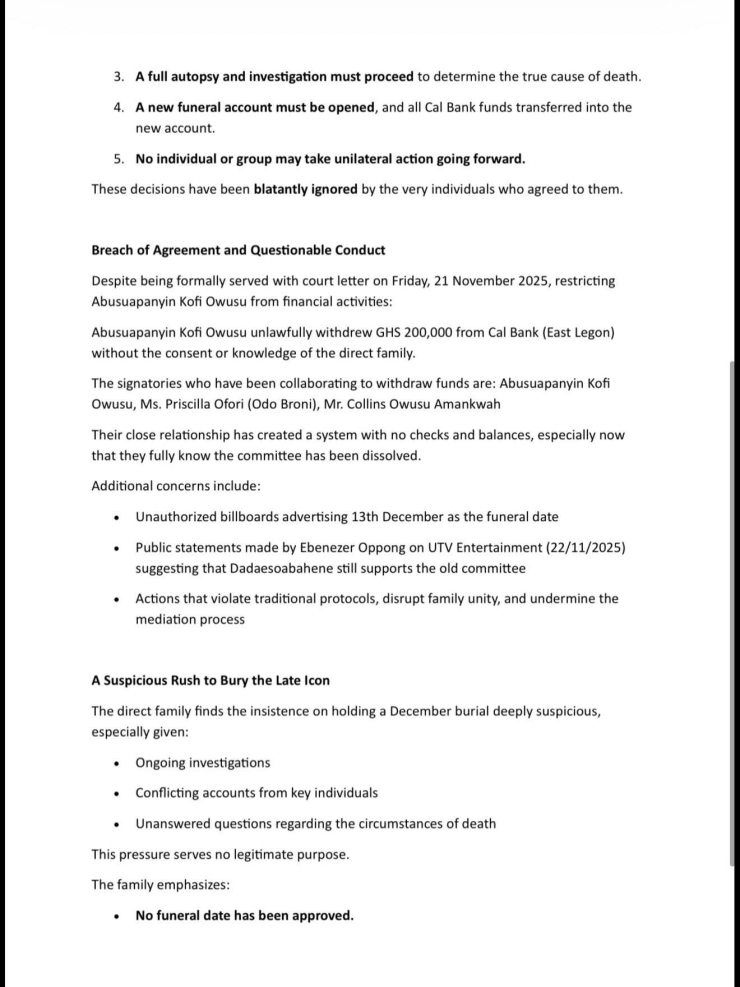 The family is directly contesting a publicly announced December funeral date, which they attribute to the dissolved funeral committee and Abusuapanyin Kofi Owusu.