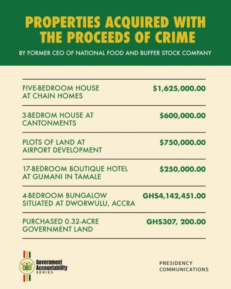 Details released by the Presidency indicate that Abdul-Wahab Hannan used the proceeds of crime to acquire multiple high-value properties across the country. Among them is a five-bedroom house at Chain Homes worth $1.625 million, a three-bedroom house at Cantonments valued at $600,000, and plots of land at Airport Development estimated at $750,000.