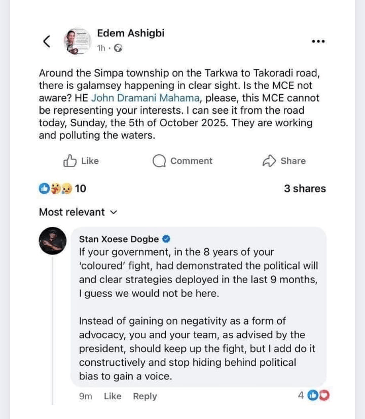 “Around the Simpa township on the Tarkwa to Takoradi road, there is galamsey happening in clear sight. Is the MCE not aware? HE John Dramani Mahama, please, this MCE cannot be representing your interests. I can see it from the road today, Sunday, the 5th of October 2025. They are working and polluting the waters.”