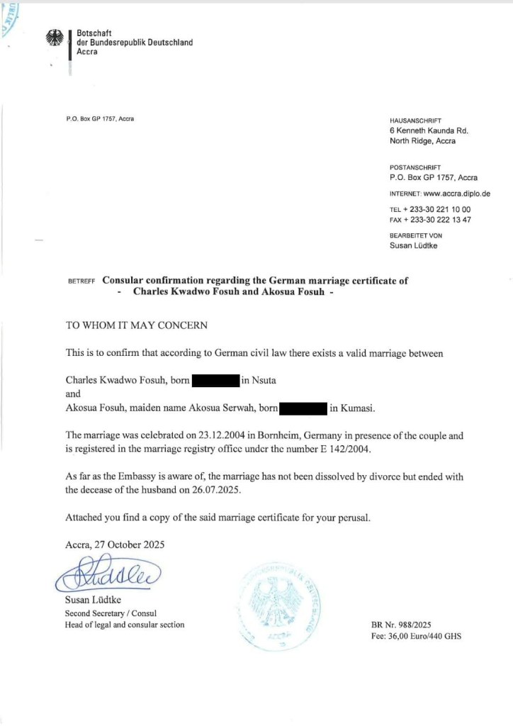 A consular letter issued on October 27, 2025, by Susan Lüdtke, Second Secretary and Consul, officially confirmed that under German civil law, “there exists a valid marriage between Charles Kwadwo Fosuh, born in Nsuta, and Akosua Fosuh, maiden name Akosua Serwah, born in Kumasi.”