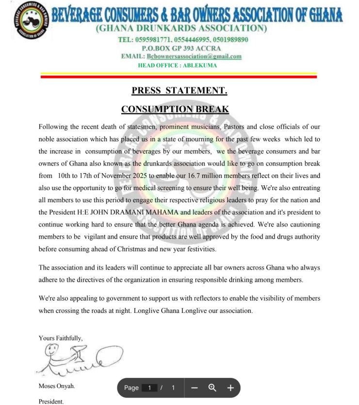 The Ghana Drunkards Association has announced a break in consumption for its members from November 10 to 17.