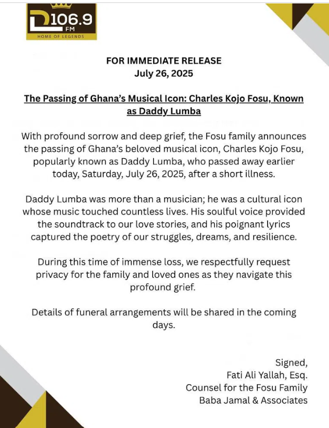 The highlife virtuoso died on 16 May 2025 following a short illness. Renowned for his emotionally resonant vocal delivery and recordings that connected profoundly with audiences, his passing occurred mere days ahead of a planned London engagement.