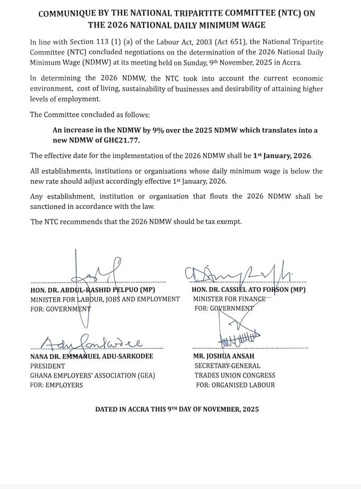 The National Tripartite Committee (NTC) has announced a 9 percent increase in Ghana’s National Daily Minimum Wage (NDMW) for 2026, raising it from the 2025 figure to GH₵21.77.
