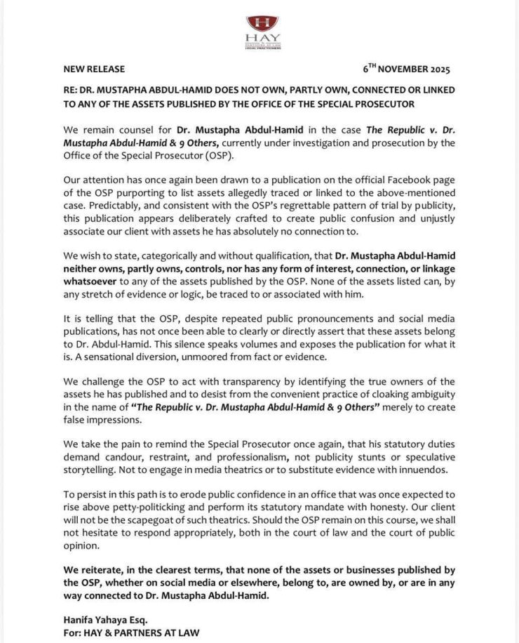 In a statement dated November 6, 2025, and signed by Hanifa Yahaya Esq. of HAY & Partners at Law, the legal team described the OSP’s recent publication as “deliberately crafted to create public confusion” and insisted that their client “has absolutely no connection” to any of the listed assets.
