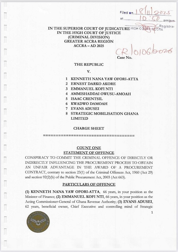The High Court of Justice, Criminal Division, has formally filed a criminal charge sheet against former Finance Minister Ken Ofori-Atta and seven others, including Ernest Darko Akore, Emmanuel Kofi Nti, Ammishaddai Owusu-Amoah, Isaac Crentsil, Kwadwo Damoah, Evans Adusei, and Strategic Mobilisation Ghana Limited (SML).