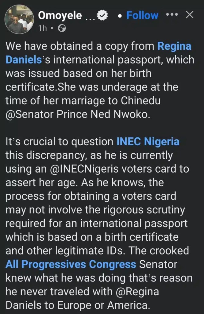 “We have obtained a copy from Regina Daniels’s international passport, which was issued based on her birth certificate. She was underage at the time of her marriage to Chinedu @Senator Prince Ned Nwoko,” Sowore stated.