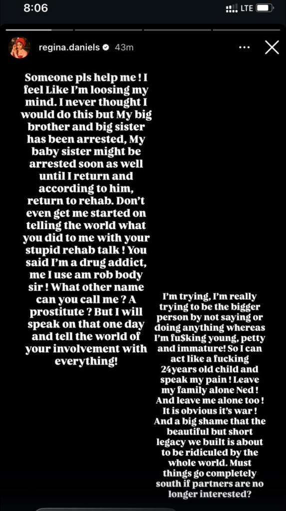 In her post, Regina claimed that both her “big brother and big sister” had been arrested, with her younger sister also facing possible detention unless she personally returns and, as she put it, “returns to rehab.” She further alleged that Ned Nwoko accused her of being a drug addict, a claim she strongly denied.