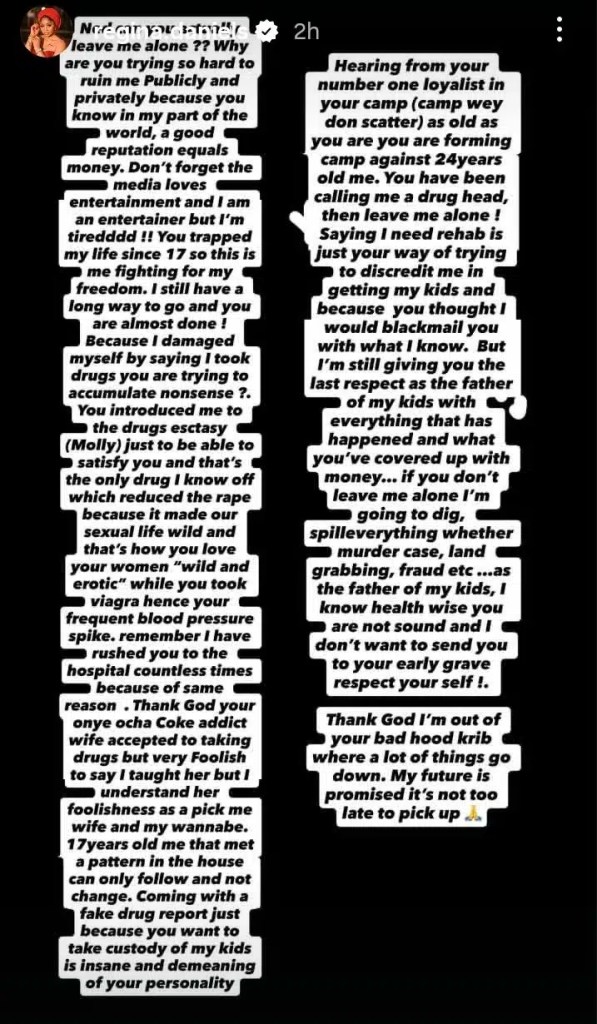 Regina Daniels has accused her husband, Ned Nwoko of using drug-related allegations to undermine her in a dispute involving their children.