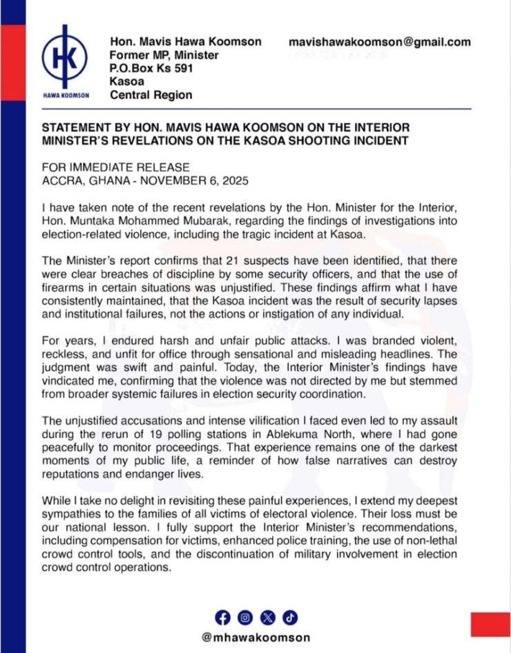 Hawa Koomson recounted the difficult period she endured after the incident, noting that she was “branded violent, reckless, and unfit for office through sensational and misleading headlines.” She added that “the Interior Minister’s findings have vindicated me, confirming that the violence was not directed by me but stemmed from broader systemic failures in election security coordination.”