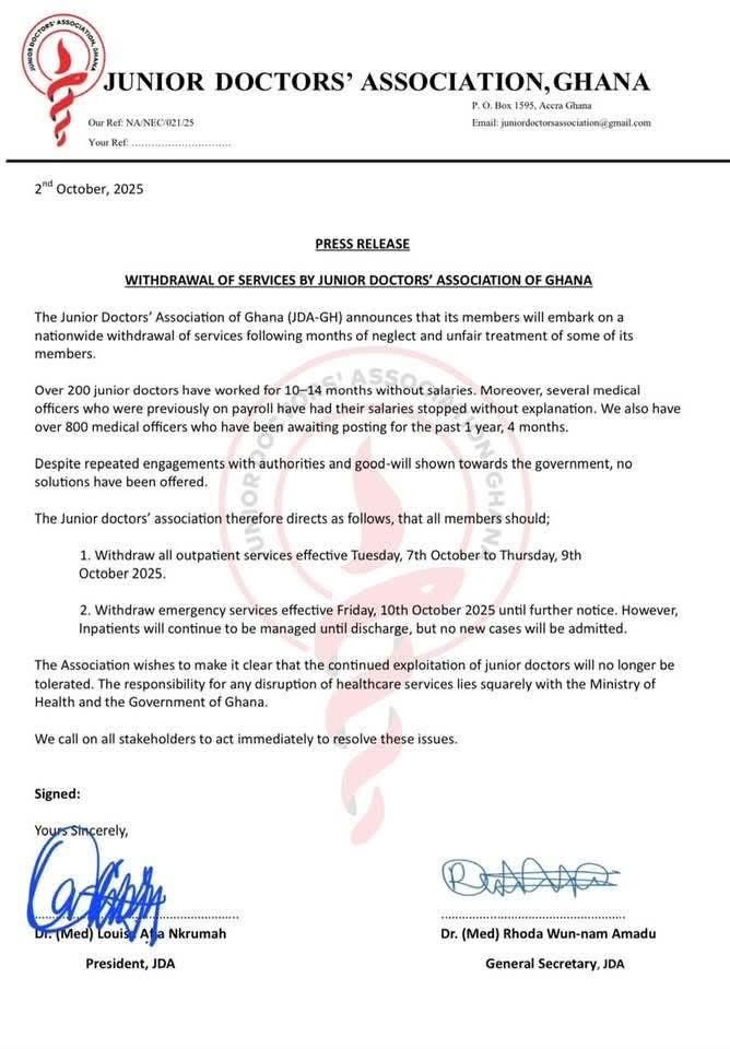 The Junior Doctors’ Association of Ghana (JDA-GH) has declared a nationwide withdrawal of services in protest of what it describes as months of neglect and unfair treatment of its members.