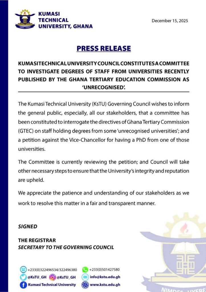 In a press release dated December 15, 2025, the Governing Council said the committee was set up to examine GTEC’s directives and a petition filed against the Vice-Chancellor over a PhD obtained from one of the affected institutions.