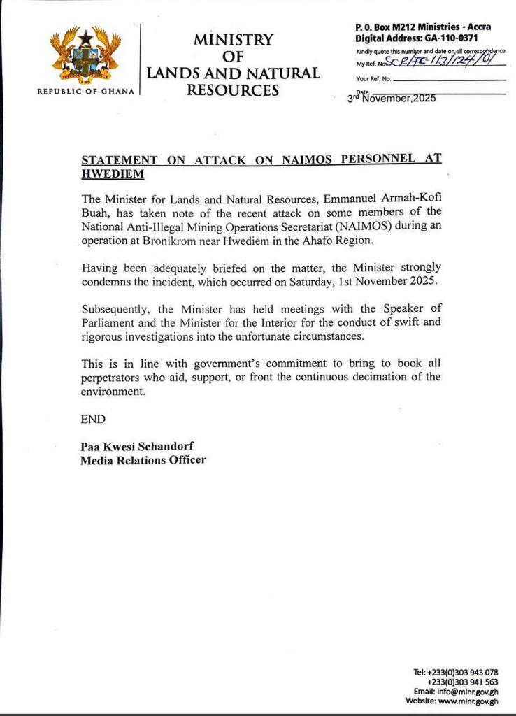 The Minister for Lands and Natural Resources, Emmanuel Armah-Kofi Buah, has strongly condemned an attack on members of the National Anti-Illegal Mining Operations Secretariat (NAIMOS) during an operation at Bronikrom near Hwediem in the Ahafo Region.