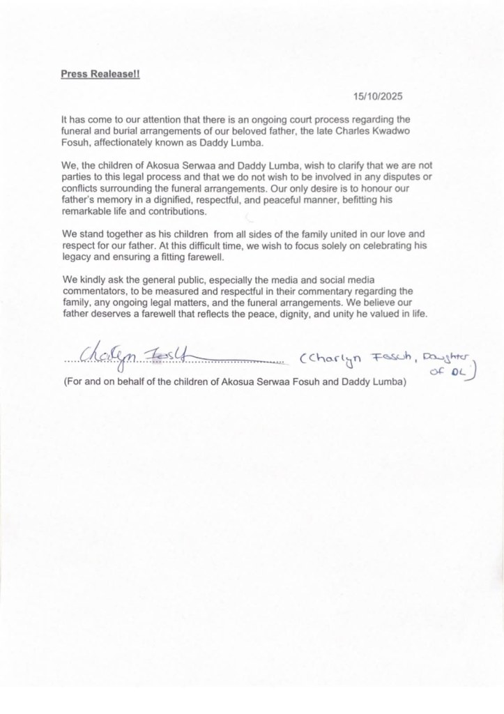 In a press release dated October 15, 2025, and signed by Charlyn Fosuh on behalf of the children of Akosua Serwaa Fosuh and Daddy Lumba, the family clarified that they are “not parties to this legal process” and “do not wish to be involved in any disputes or conflicts”* related to the funeral.