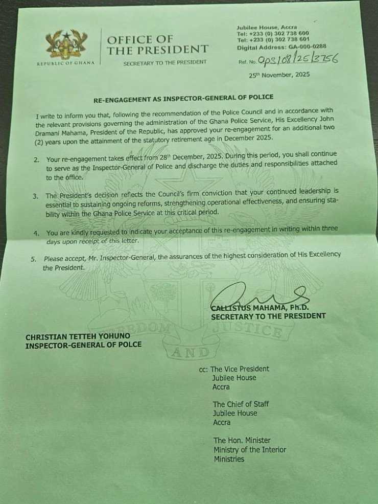 The letter stated that President Mahama’s approval “reflects the Council’s firm conviction that your continued leadership is essential to sustaining ongoing reforms, strengthening operational effectiveness, and ensuring stability within the Ghana Police Service at this critical period.”