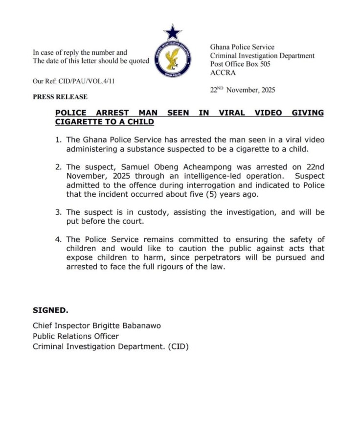 The Ghana Police Service has arrested Samuel Obeng who was seen in a viral video administering a substance suspected to be cigarette to a child.