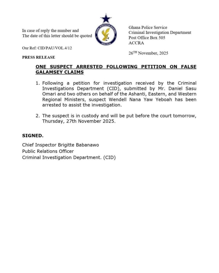 According to the CID, the arrest was made “following a petition for investigation received… submitted by Mr. Daniel Sasu Omari and two others on behalf of the Ashanti, Eastern, and Western Regional Ministers.”