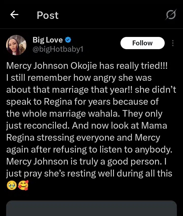 “They only just reconciled. And now look at Mama Regina stressing everyone and Mercy again after refusing to listen to anybody. Mercy Johnson is truly a good person.