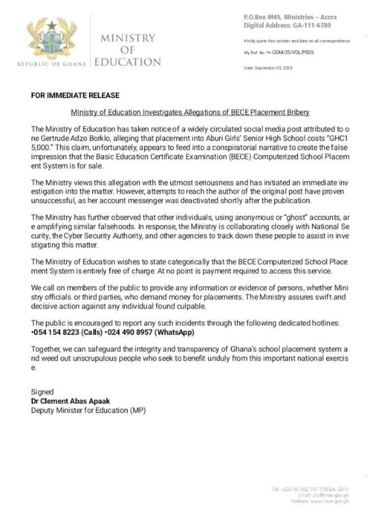Reacting to this, Deputy Minister for Education, Dr. Clement Abas Apaak, said the Ministry has “initiated an immediate investigation into the matter,” describing the allegations as “a conspiratorial narrative to create the false impression that the BECE Computerized School Placement System is for sale.”