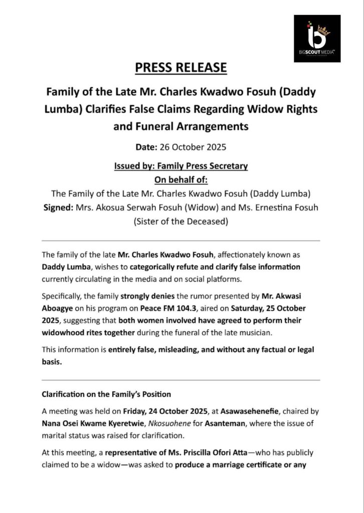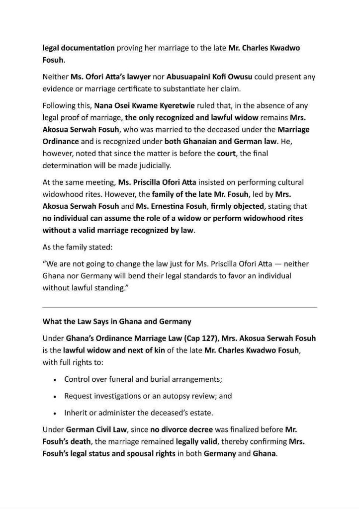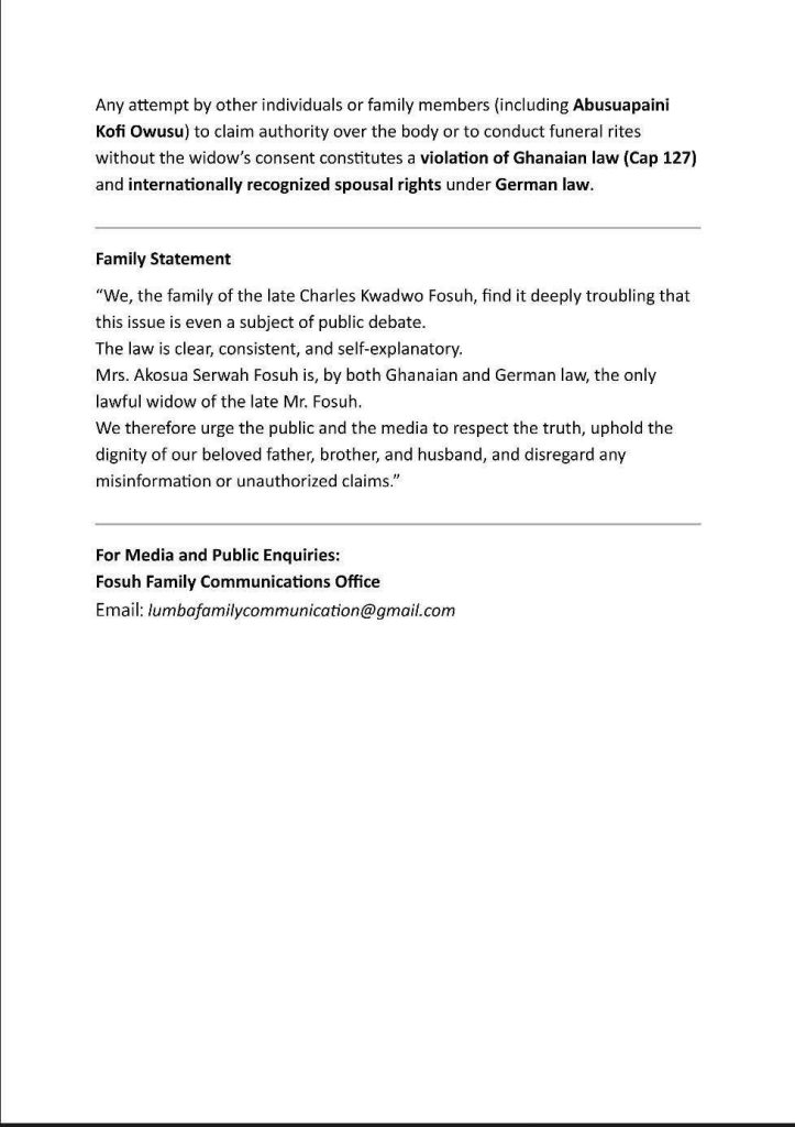 A statement issued on October 26, 2025, stressed that under both Ghanaian and German law, “the only recognized and lawful widow remains Mrs Akosua Serwah Fosuh.”