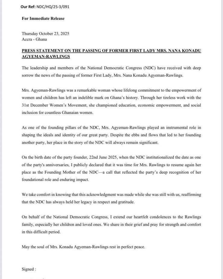 The statement expressed joy in the fact that while she was alive, she was invited to come back to the National Democratic Congress (NDC) as their founding member; an indication that her legacy was still held in high esteem.