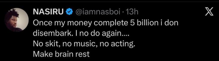 Nigerian skitmaker and singer Nasiru Bolaji Lawal, popularly known as Nasboi, has garnered attention on social media after saying he would quit entertainment and slip into oblivion once he reaches a personal financial target.