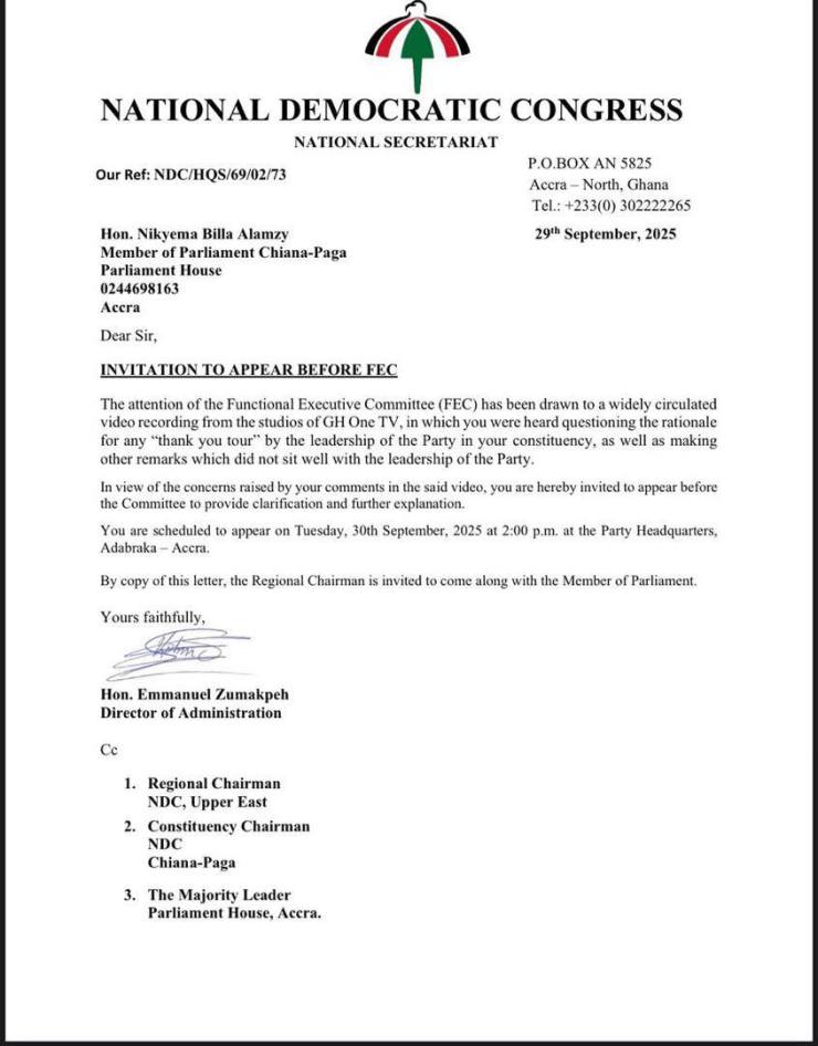 Member of Parliament for Chiana Paga, Hon Nikyema Billa Alamzy, has been summoned by the Functional Executive Committee of the National Democratic Congress (NDC).