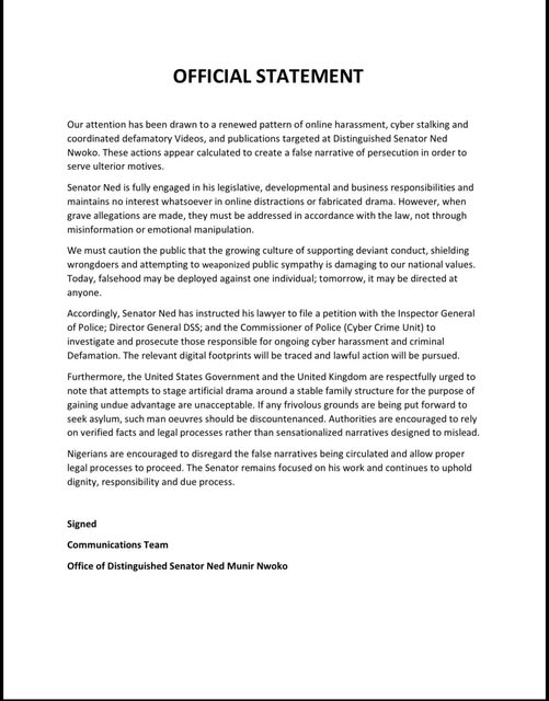 Senator Ned Nwoko has urged authorities in the United States and United Kingdom to scrutinize any asylum claims linked to what he describes as fabricated narratives built around his family.