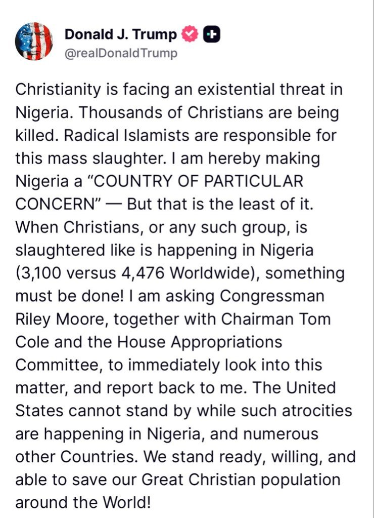 He warned that Washington would not look away. “When Christians, or any such group, is slaughtered like is happening in Nigeria… something must be done! The United States cannot stand by while such atrocities are happening,” he said, adding that the U.S. stands “ready, willing, and able to save our Great Christian population around the World.”