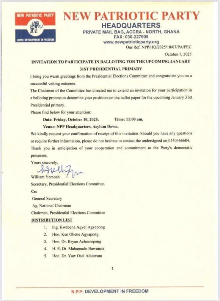 The New Patriotic Party (NPP) has officially invited its presidential aspirants to participate in a balloting exercise to determine their positions on the ballot paper for the upcoming January 31, 2026, presidential primary.