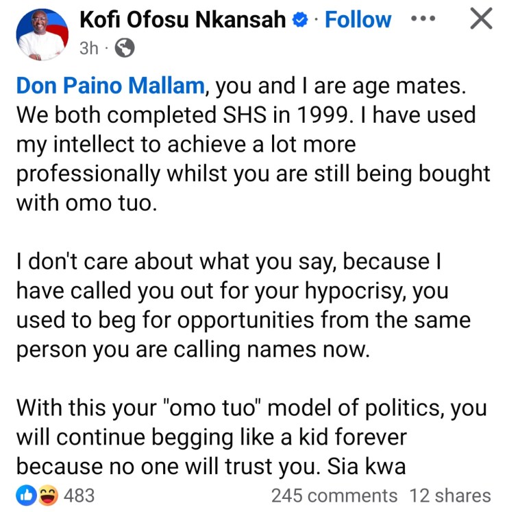 Ofosu Nkansah blasts Don Paino Mallam over ‘Omo Tuo’ politics