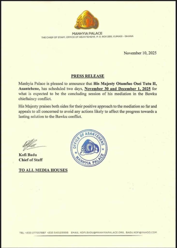 The Manhyia Palace has announced that His Majesty Otumfuo Osei Tutu II, Asantehene, will hold the final sessions of his mediation in the long-standing Bawku chieftaincy conflict on November 30 and December 1, 2025.