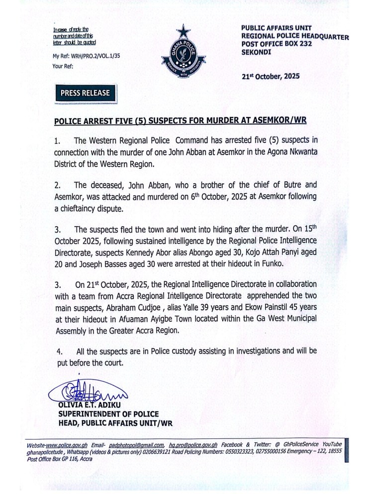 The Western Regional Police Command has confirmed the arrest of five suspects in connection with the murder of John Abban at Asemkor in the Agona Nkwanta District of the Western Region.