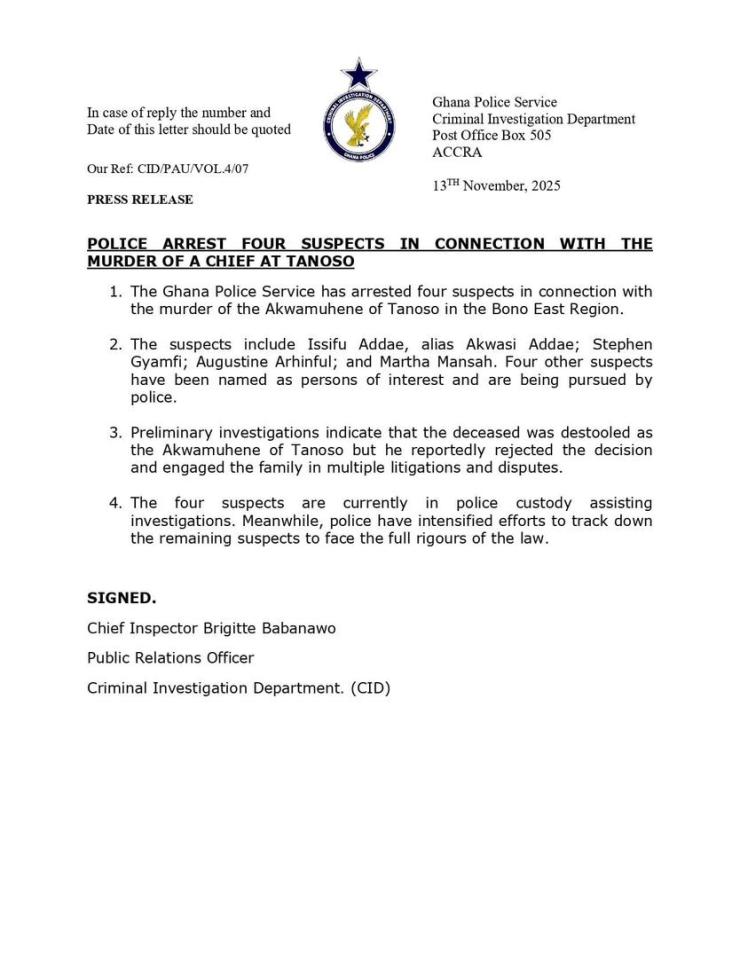 Police have arrested four individuals in connection with the murder of the Akwamuhene of Tanoso in the Bono East Region.