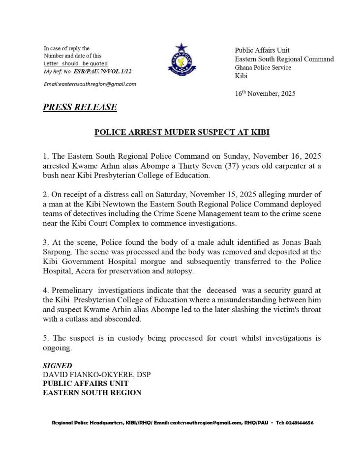 The Eastern South Regional Police Command has arrested a 37-year-old carpenter, Kwame Arhin, also known as Abompe, on suspicion of murdering a security guard at Kibi Presbyterian College of Education.