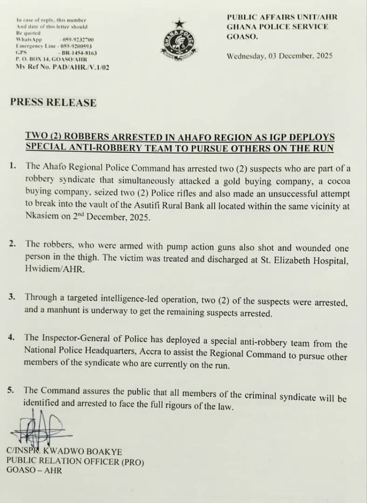 The Ahafo Regional Police Command has arrested two suspects believed to be part of a robbery syndicate that carried out coordinated attacks on a gold-buying company, a cocoa-buying firm, and attempted to break into the vault of the Asutifi Rural Bank at Nkasiem on December 2, 2025.