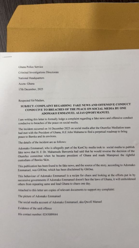 The complaint, dated December 17, 2025, accuses one Adomako Emmanuel, also known online as Qwofi Manuel, of circulating false information following the Otumfuo Mediation Team’s meeting with President John Dramani Mahama aimed at finding a lasting solution to the Bawku conflict.