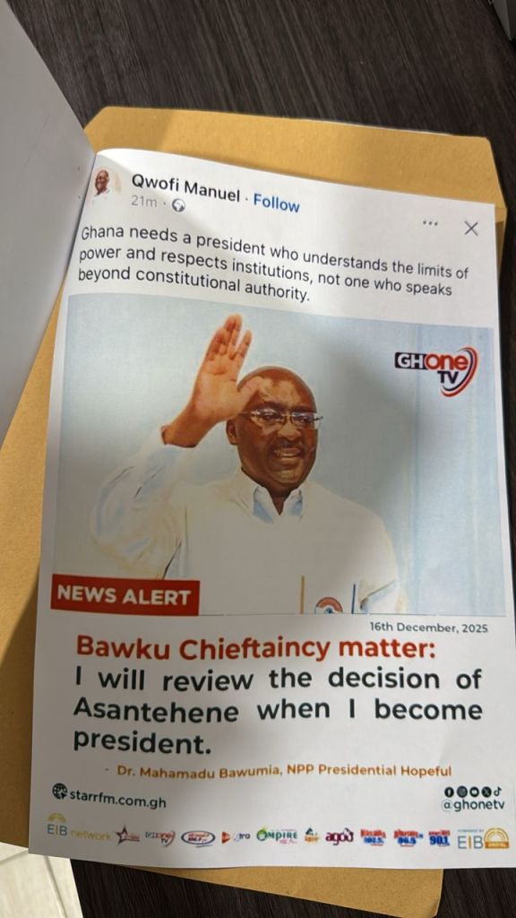 According to the letter addressed to the CID at the Police Headquarters in Accra, the incident occurred on December 16, 2025, when Adomako Emmanuel allegedly associated with KenCity Media published claims on social media suggesting that Dr. Mahamudu Bawumia had stated he would reverse decisions taken by the Otumfuo Committee if elected president and recognize the Mamprusi as rightful custodians of Bawku skin.