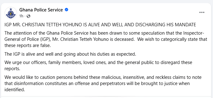 The Ghana Police Service has dismissed widespread social media rumours alleging the death of the Inspector-General of Police (IGP), Mr. Christian Tetteh Yohuno, describing the claims as entirely fabricated.