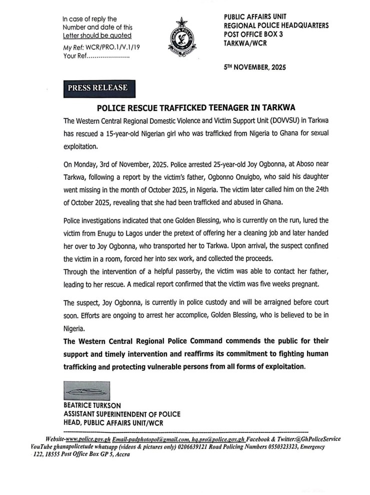 The Western Central Regional Police have rescued a 15-year-old Nigerian girl who was trafficked to Tarkwa for sexual exploitation. A 25-year-old woman, Joy Ogbonna, is in custody for her alleged role.