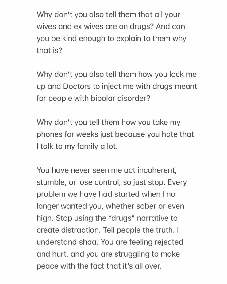 She urged Ned to stop trying to control her life and accept that the relationship has ended. “Leave me alone, Ned. Marriage is not by force. Love is not by force. Stop trying to control what no longer belongs to you,” she added.
